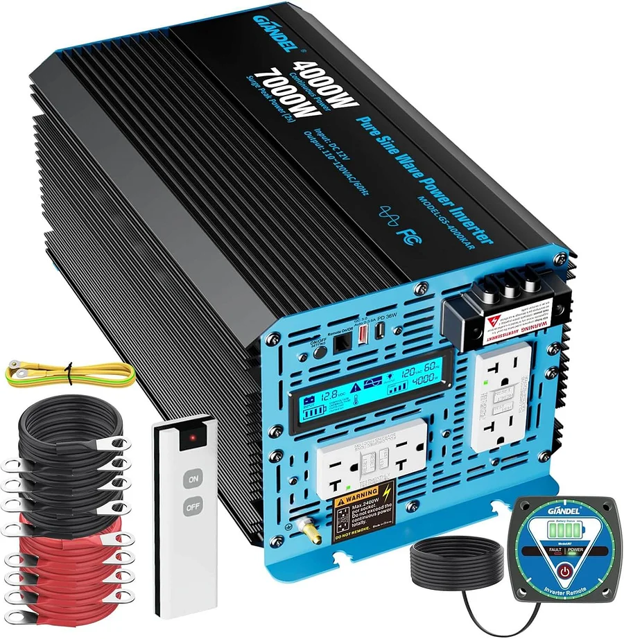 【2025 PATENTED 4000Watt Pure Sine Wave Inverter】This 4000 watt inverter pure sine wave is a NEW and PANTENTED version with Surge Power 7000 Watt for 2 Seconds converts 12V DC to AC 110V-120V,which is ideal to install in RVs, Vessels,Off Grid Solar system for water pump,air conditioner, hair dryer, microwave,air compressor and other sensitive high startup power equipments.