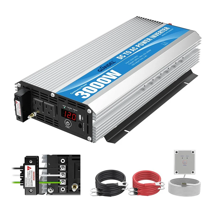 【 What you will get】A 3000 W modified sine wave inverter,1 wired remote switch with 30 ft cable , 2 black & 2 red 4 AWG equals to 1AWG battery cables with ring terminals , 1 user manual , shock proof pads,18-month warranty & GIANDEL friendly customer service. Please read the instruction manual before using this inverter.